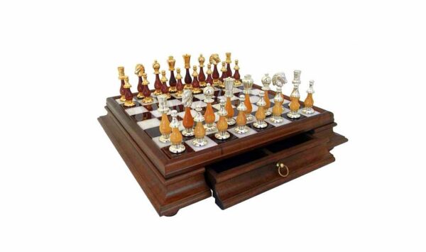Ensemble Large Echiquier Oriental en Bois Massif et Plateau en Albâtre de Toscane avec Tiroir de Rangement et Jeu d’Echecs en Bois & Laiton Plaqué Or et Argent