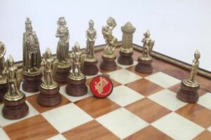Jeu d’Echecs Mary Stuart – Échiquier sur Pied Bois d’Orme & Bruyère & Jeu d’Échecs Métal & Bois